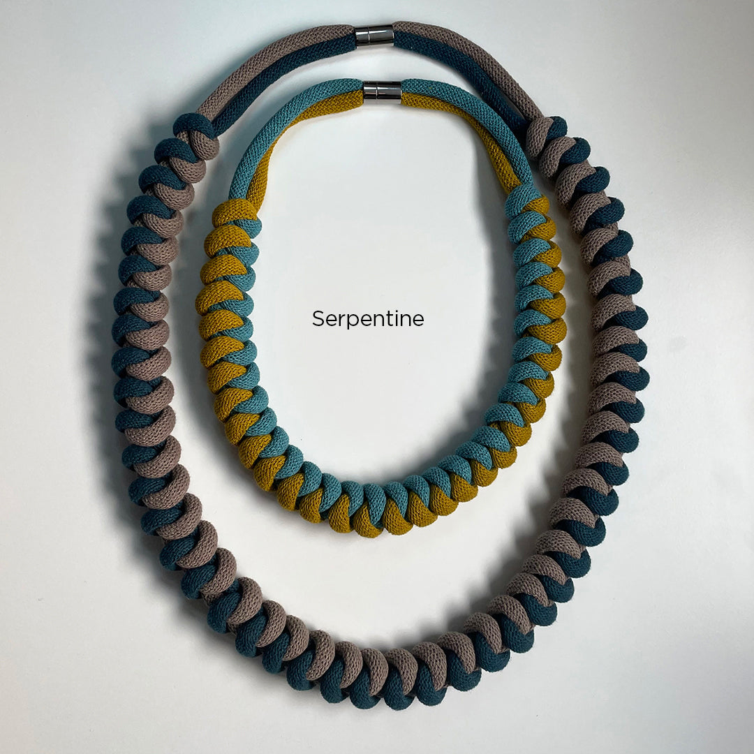 The two tone Serpentines are made to order. Simply send me a message with your own colour combination for short collars – $60 or long loops – $80.