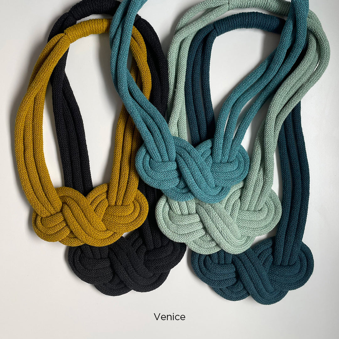 Great statement jewellery knotted with recycled cotton cords in loads of colours. Choose from the classic Figure 8 knot or the Larks Head. Short collars are around 50cm in diameter are $40 and long loops at 70cm to 90cm diameter at $60. Magnetic clasps are stainless steel. Venice knots are a medium length necklace at about 60cm in diameter, also $40 each.